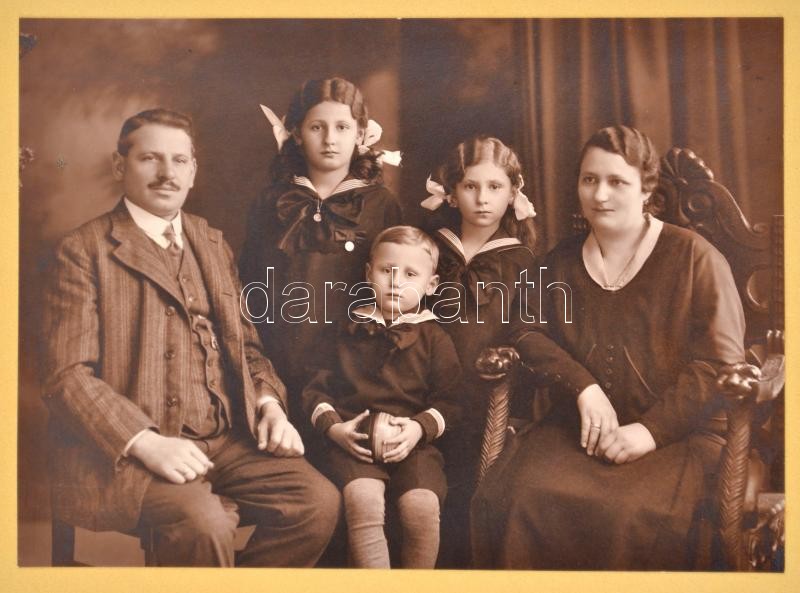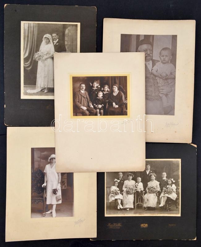 Beschreibung: cca 1925-1931 Képek a Weber-család életéből: esküvői fotó, életképek, csoportképek, 5 db nagyméretű fotó Leon H. és Fia műterméből, részben jelzettek, hátuljukon feliratozva, különböző méretben