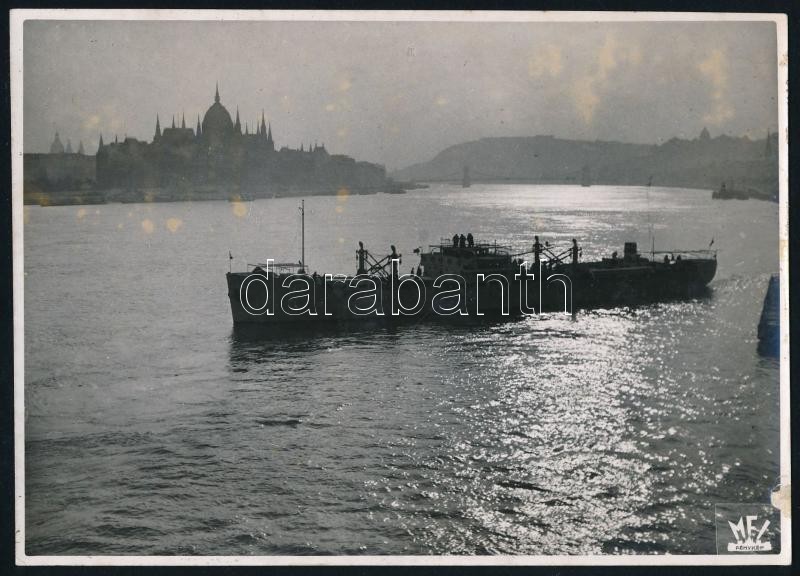 Beschreibung: cca 1935 Budapest, A Tisza hajó végighalad a Dunán a Parlament előtt, MFI fotó, hátoldalon feliratozva, 12×17 cm