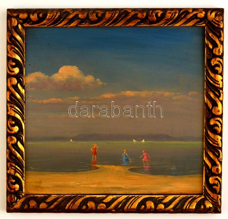 Beschreibung: Kerekes József (1892-1938): Fürdőzés a Balaton déli partján, olaj, karton, hátulján jelzett, fa keretben, 25×26,5 cm