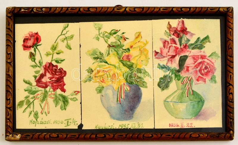 Beschreibung: Kopácsi jelzéssel: Nemzetiszín virágok, 3 db akvarell, papír, üvegezett fa keretben, 8×14 cm