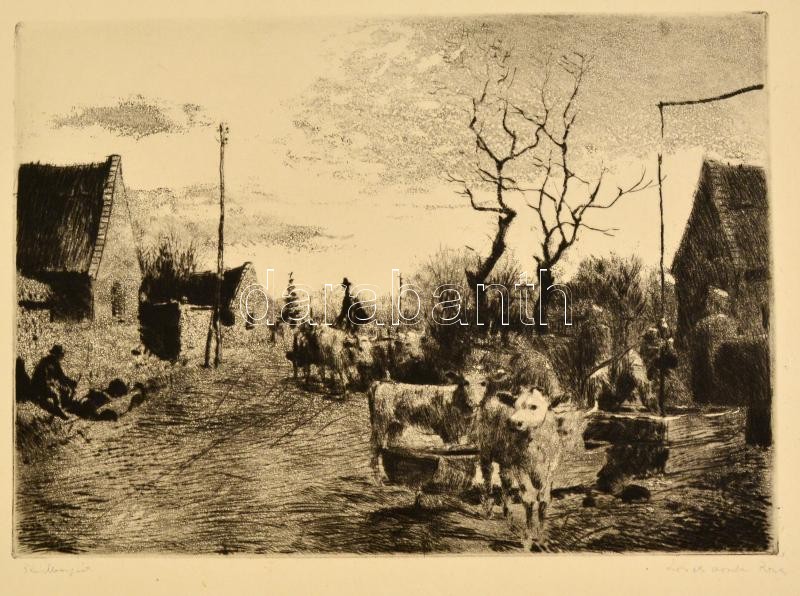 Beschreibung: Olvashatatlan jelzéssel: Kisborjúk. Rézkarc, papír, 23×33 cm