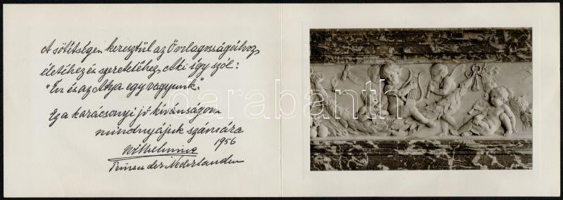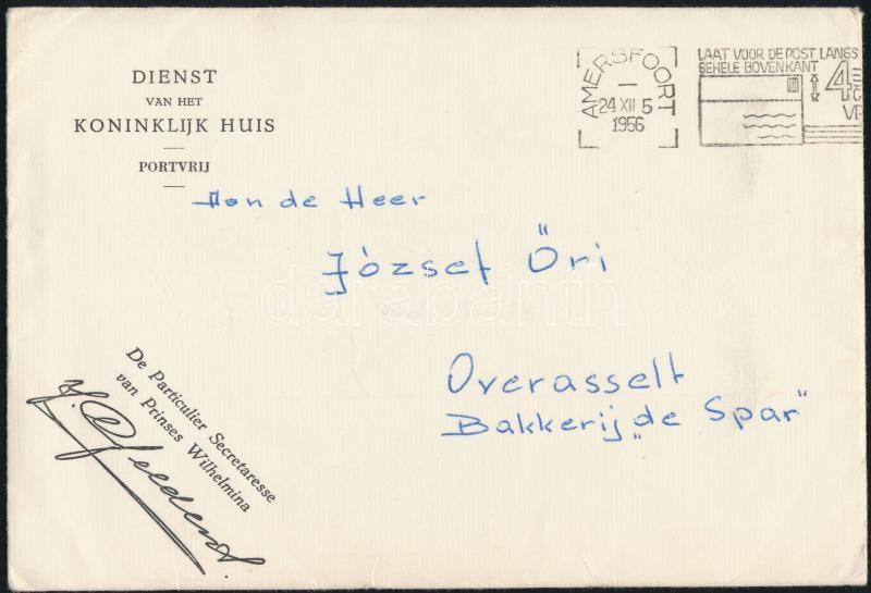 1956 I. Vilma (1880-1962), korábbi holland királynő (ur. 1890-1948) magyar nyelvű karácsonyi jókívánsága Őri József részére overasselti pékségbe megküldve, borítékkal, a borítékon Jeannette Geldens (1902-1999), Vilma személyi titkárnőjének aláírásával