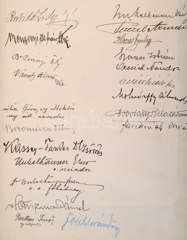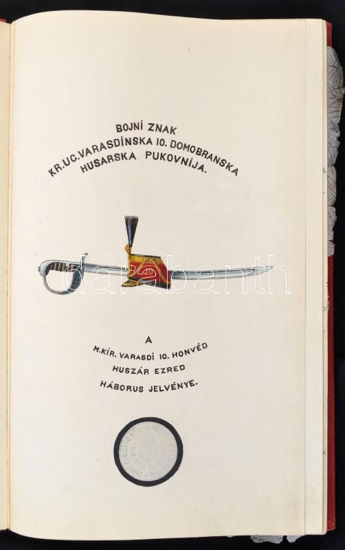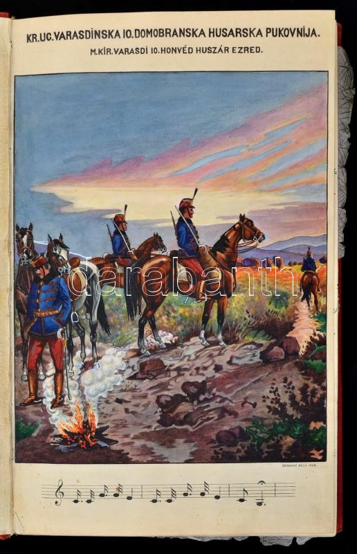 1936-1943 A volt m. kir. varasdi 10. honvéd huszárezred "emlékkönyve." Az ezred egykori katonájának Várady Albert által összeállítva, saját kezű kézírásával, egy helyen 3 gépelt sorral. Benne a "Vadászkürt" szállodában elhangzott ünnepi beszédek lejegyzett anyagával. A lapokon izgalmas fotó anyaggal, összesen 15 db, többségében eredeti fotókkal, de közte kisebb részben későbbi előhívású, legkésőbb az 1940-es években előhívott fotókkal is, továbbá egy újságkivágásos fotóval. A fotók egy részén az huszárezred parancsnokainak fotóival, (az összeállítás végül nem sikerült teljesre, 4 helyen csak nevek), 2 db korai csoportképes fotóval (az egyik későbbi előhívás), 3 db fotón az összejövetel fotóival, valamint dobokai és Jenői Dobokay Béla vezérőrnagynak a m.kir. varasdi 10. honvéd huszárezredről készült grafikájával (vegyes technika, papír, jelzett, 24×20 cm). A ,,Vadászkürtös" összejöveteleken szereplők fotóival (3 db összejöveteles fotó), és saját kezű aláírásaikkal a megemlékezéseknél. Köztük: Várady Albert (1870-?) ezredes, Boromisza Tibor Előd (1880-1960) százados, festőművész, Álgya Sándor (1877-1961) altábornagy, egyházasberzsenyi Berzsenyi István (1878-?) tábornok, vitéz görgői és toporczi Görgey Miklós (1880-1943) ezredes, a m. kir koronaőrség parancsnoka, dálnoki Veress Lajos (1889-1976) vezérezredes, hadtörténész, vitéz dálnoki Miklós Béla (1890-1948) vezérezredes, politikus, majd miniszterelnök (1944-1945), dobokai és Jenői Dobokay Béla (?-?) vezérőrnagy, bonyhádi Perczel Armand (1876-1956) tábornok, zágorjei, zichi és zajki Rubido-Zichy Iván (1874-1964) diplomata, követ, báró Perényi Ödön (1864-1940) százados, országgyűlési főterembiztos. A későbbi előhívásos csoportképen a fiatal Boromisza Tibor Előd százados (akkor még tiszthelyettes), festőművész és Várady Albert ezredes (akkor még főhadnagy) is szerepel. Korabeli aranyozott egészvászon-kötésben. / Memorial album of 10th Hungarian Hussar Regiment, with original photos, newspaper cut, handwritings, in golden linen binding