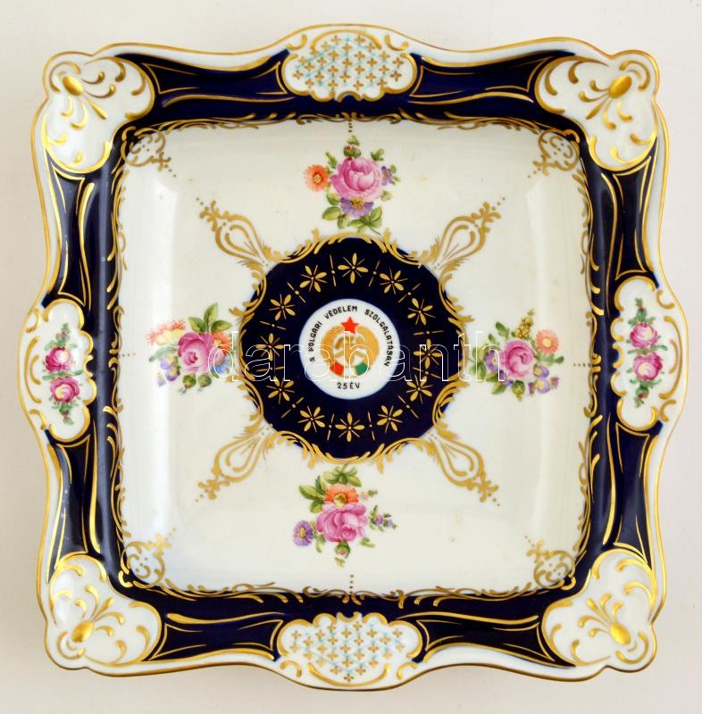 Beschreibung: Hollóházi "25 év a Polgári Védelem Szolgálatában" dísztál, kézzel festett, jelzett, hibátlan, eredeti viseltes dobozában, 29x29 cm