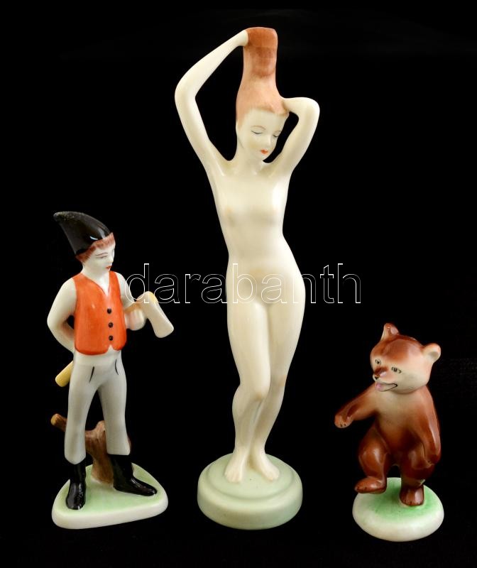 Beschreibung: Hollóházi és Aquincumi porcelán figurák, 3 db, kézzel festett, jelzett, egyik mázhibával, m: 9, 15, 22,5 cm