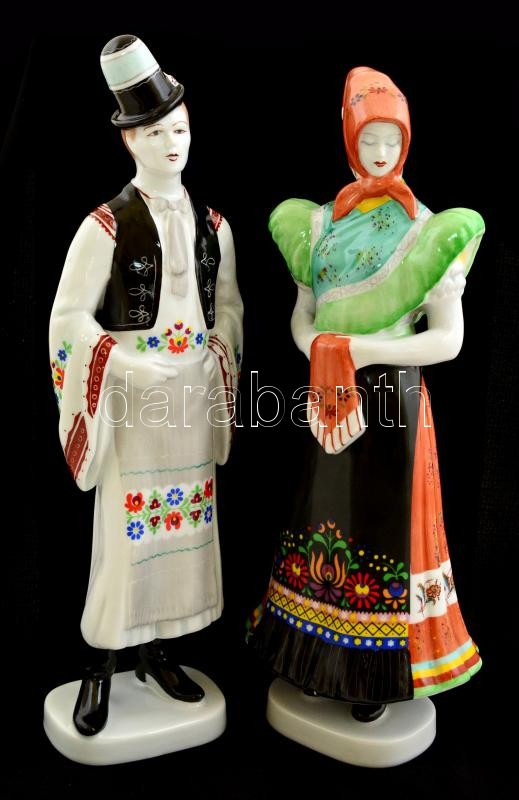 Beschreibung: Hollóházi népviseletes pár, részben kézzel festett, jelzettek, apró kopásokkal, m: 30 cm