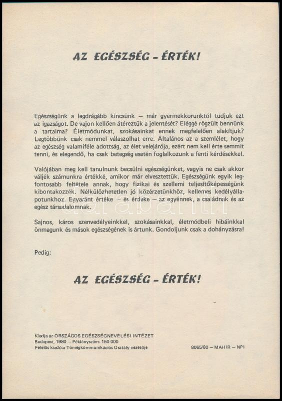 Beschreibung: 1980 Bp., Az egészség - érték! szórólap, kiadja: az Országos Egészségnevelési Intézet, 24×17 cm