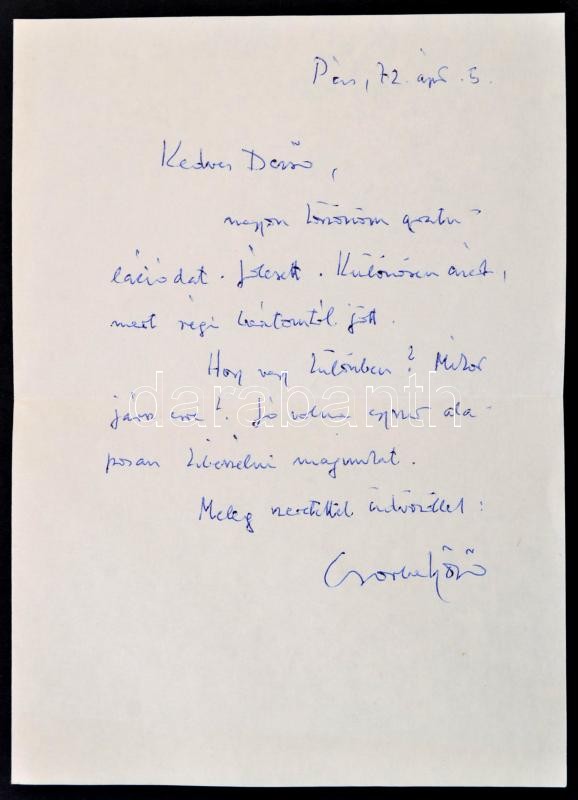 1972 Csorba Győző (1916-1995) Kossuth-díjas költő, műfordító saját kézzel írt sorai és aláírása egy Szilágyi Dezső (1922-2010) bábművésznek, az Állami Bábszínház igazgatójának szóló levélen.