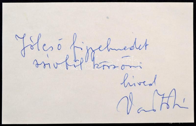 cca 1980 Vas István (1910-1991) Kossuth-díjas magyar költő, író, műfordító üdvözlő sorai és aláírása egy Szilágyi Dezső (1922-2010) bábművésznek, az Állami Bábszínház igazgatójának szóló kártyán.