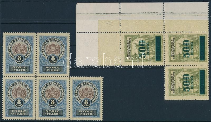 Beschreibung: Budapest székesfőváros 8f ötöstömb + felülnyomott 500P/50f hármastömb