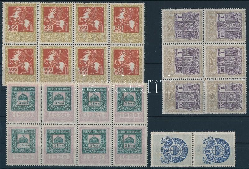 Okmánybélyeg 2f, 20f, 1K és 3K összefüggésekben https://www.darabanth.com/de/324-Fernauktion/324.0/Andere-Sammelgebiete/Stempelmarken~17/Okmanybelyeg-2f-20f-1K-es-3K-osszefuggesekben~II1801786