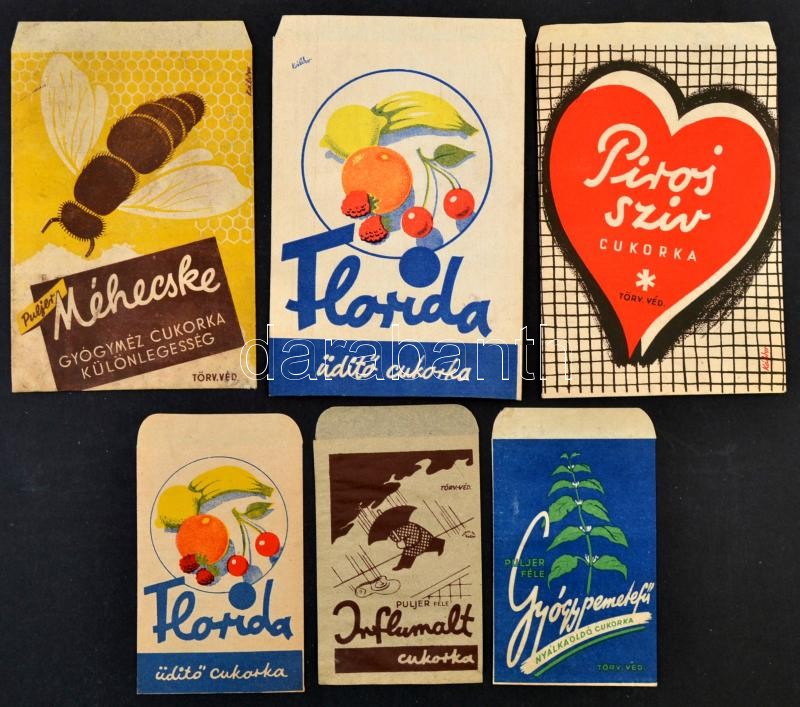 cca 1940 6 féle gyógyszertári gyógycukorka reklámos papírtasak https://www.darabanth.com/de/324-Fernauktion/324.0/Andere-Sammelgebiete/Werbungen~23/cca-1940-6-fele-gyogyszertari-gyogycukorka-reklamos-papirtasak~II1803396
