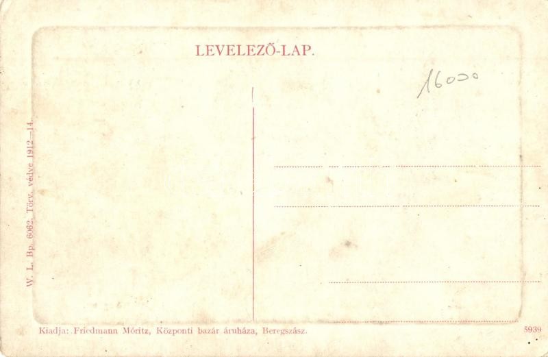 Beschreibung: Beregszász, Berehove; Werbőczy tér, Zsinagóga, Polgári vendéglő, étterem, Mozgófénykép színház (mozi). W. L. Bp. 6062. Kiadja Friedmann Móritz / square, synagogue, restaurant, cinema (EK)