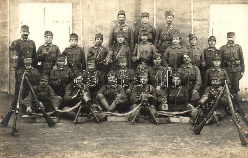 Beschreibung: Osztrák-magyar gépfegyver osztály, a gépfegyverek és pisztolyok tüzelésre kész állapotban / WWI Austro-Hungarian K.u.K. machine gun division ready to shoot. photo