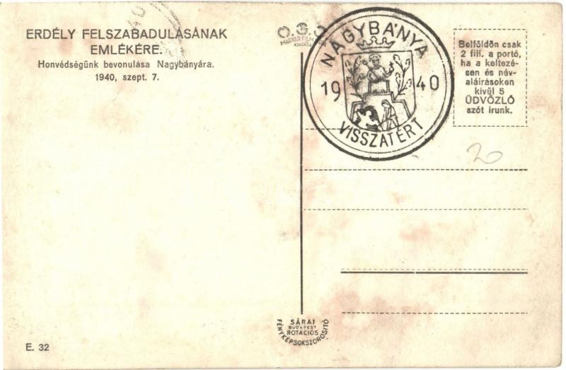 Beschreibung: 1940 Nagybánya, Baia Mare; bevonulás / entry of the Hungarian troops + 1940 Nagybánya visszatért So. Stpl. (felületi sérülés / surface damage)