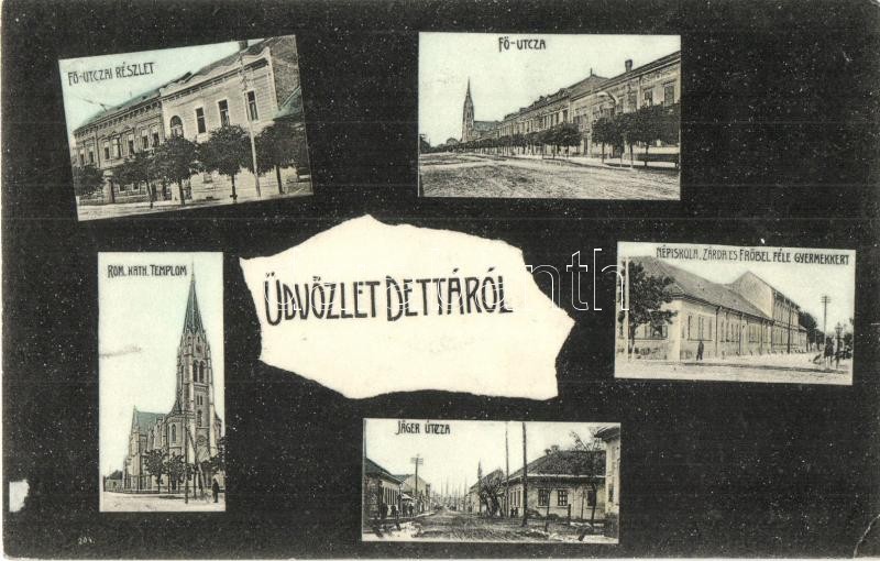 Detta, Ghedu, Deta; Fő utca, Római katolikus templom, Jäger utca, Népiskola, zárda, Fröbel-féle gyermekkert. Ballon kiadása / main street, church, school, nunnery, kindergarten (EK)