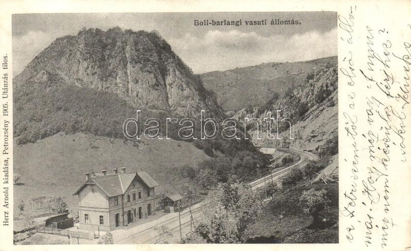Beschreibung: Petrozsény, Petrosani; Boli barlang-i vasútállomás vagonokkal. Herz Arnold kiadása / railway station, wagons