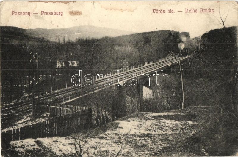 1911 Pozsony, Pressburg, Bratislava; Vörös híd, vasúti híd gőzmozdonny... https://www.darabanth.com/de/324-Fernauktion/324.0/Ansichtskarten/Slowakei~2000008/1911-Pozsony-Pressburg-Bratislava-Voros-hid-vasuti-hid-gozmozdonnyal-Rothe-Brucke-rai~II1802106