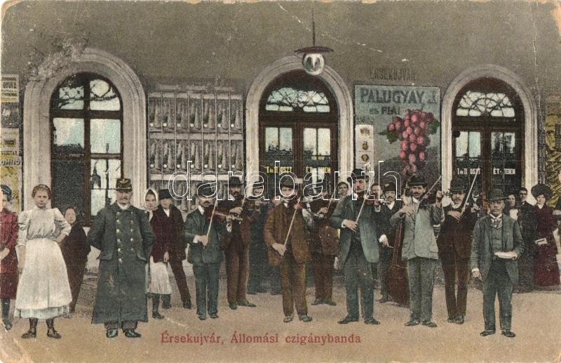 1913 Érsekújvár, Nové Zámky; Vasútállomási cigány muzsikus banda, Palugyay és fiai reklám poszter, belső / Bahnhof / railway station with gypsy music band, advertisement poster, interior (fa)