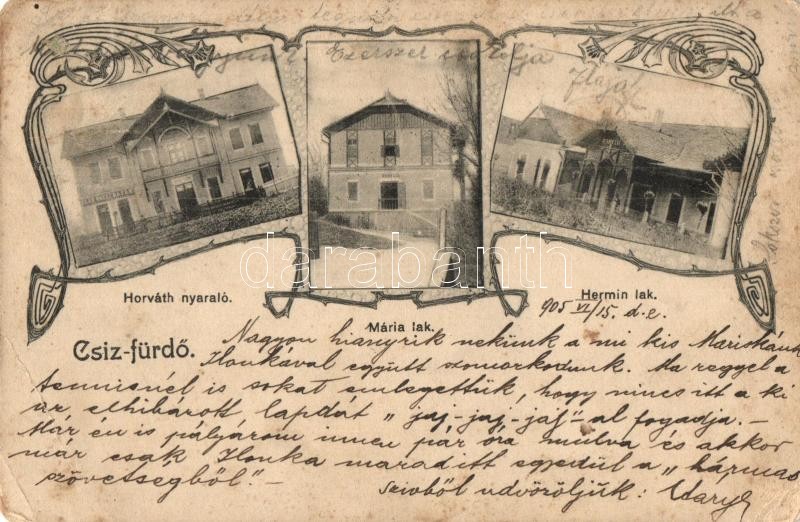 Csízfürdő, Kúpele Ciz; Horváth nyaraló, Mária lak, Hermin lak, villa /... https://www.darabanth.com/de/324-Fernauktion/324.0/Ansichtskarten/Slowakei~2000008/Csizfurdo-Kupele-Ciz-Horvath-nyaralo-Maria-lak-Hermin-lak-villa-villas-Art-Nouveau-E~II1800655