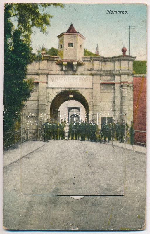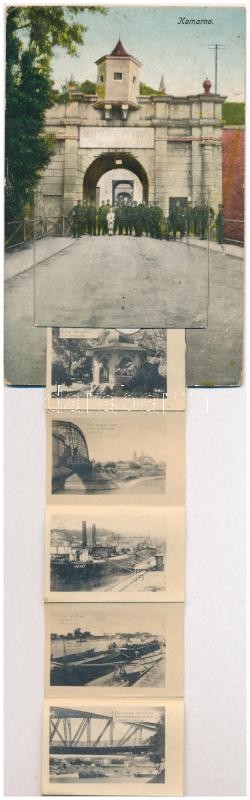 Komárom, Komárno; Várkapu katonákkal. leporellolap, belül: Tiszti pavilon, Zenepavilon, Kis-Duna híd, Kikötő, Katona kórház / castle gate with soldiers. leporellocard, inside: Officers' pavilion, music pavilion, Danube bridge, port, military hospital (Rb)