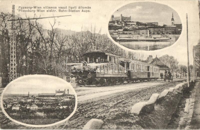 Beschreibung: Pozsony, Pressburg, Bratislava; Pozsony-Bécs villamos vasút ligeti állomás, mozdony, gőzhajó / Pressburg-Wien electr. Bahn-Station Aupark / tramway station, locomotive, steamship
