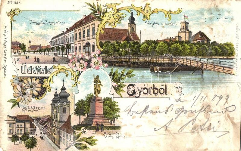 1899 Győr, Kossuth Lajos utca, Hajóhíd (pontonhíd) a Dunán, Kisfaludy Károly szobor, Szent Benedek rendi gimnázium és templom. Kiadja Polgár Bertalan No. 1877. Krecsmar és Sacz, Art Nouveau, floral, litho (vágott / cut)