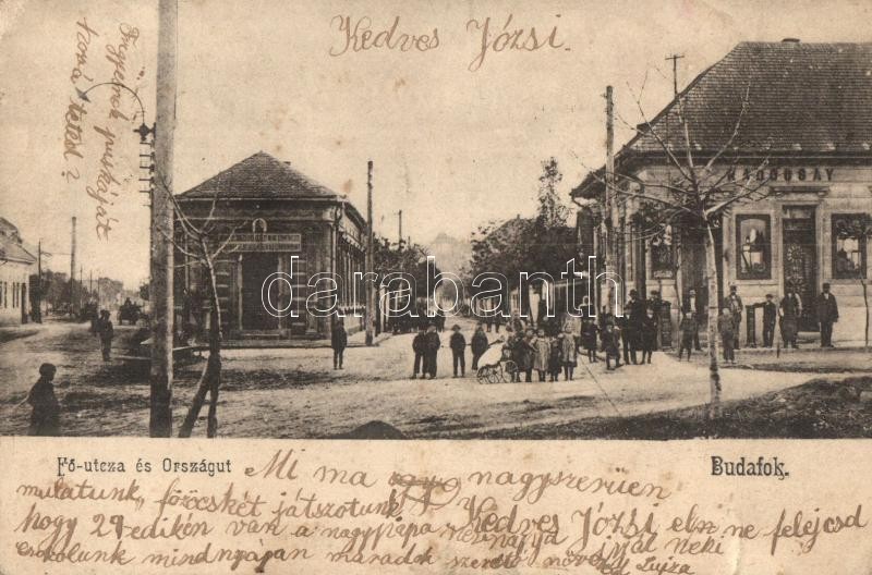 Beschreibung: 1902 Budapest XXII. Budafok, Fő utca és Országút, Kadocsay üzlete, egylet szövetkezete (Rb)