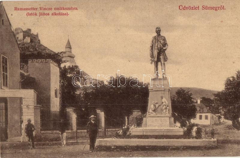 Beschreibung: 1908 Sümeg, Ramassetter Vincze (kékfestő, iskolaalapító, városi tanácsnok) emlékszobra, háttérben vár. Horvát Gábor kiadása