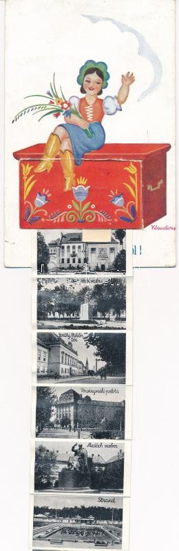 Beschreibung: Balassagyarmat, népviseletes leporellolap, belül: Rendőrségi palota, Hősök szobra, Horthy Miklós tér, Strand, Fegyintézet, börtön. s: Klaudinyi (EK)