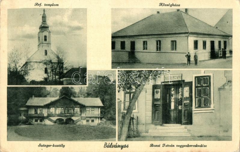 Beschreibung: Bálványos, Református templom, Községháza, Satzger kastély, Bozai István üzlete (EK)