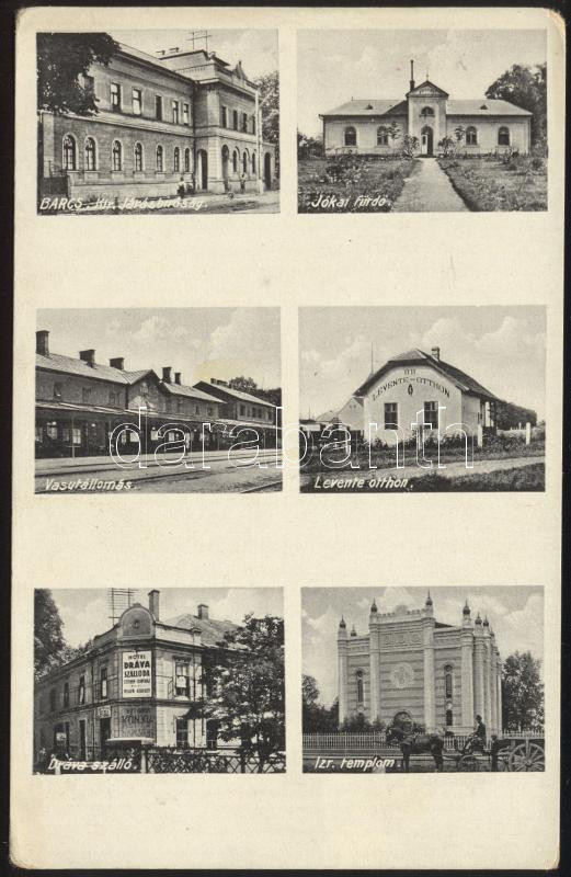Beschreibung: Barcs, Kir. Járásbíróság, Jókai fürdő, Levente otthon, Dráva szálló, vasútállomás, zsinagóga