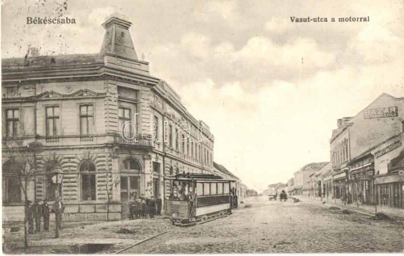 Békéscsaba, Vasút utca a motorral, városi vasút, Petrányi Gyula bazára... https://www.darabanth.com/de/324-Fernauktion/324.0/Ansichtskarten/Ungarn~2000006/Bekescsaba-Vasut-utca-a-motorral-varosi-vasut-Petranyi-Gyula-bazara-szalloda-es-kaveh~II1803039