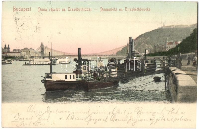 Budapest, Duna részlet Erzsébet híddal, gőzhajók. Taussig Arthur 5328. https://www.darabanth.com/de/324-Fernauktion/324.0/Ansichtskarten/Ungarn~2000006/Budapest-Duna-reszlet-Erzsebet-hiddal-gozhajok-Taussig-Arthur-5328~II1802943