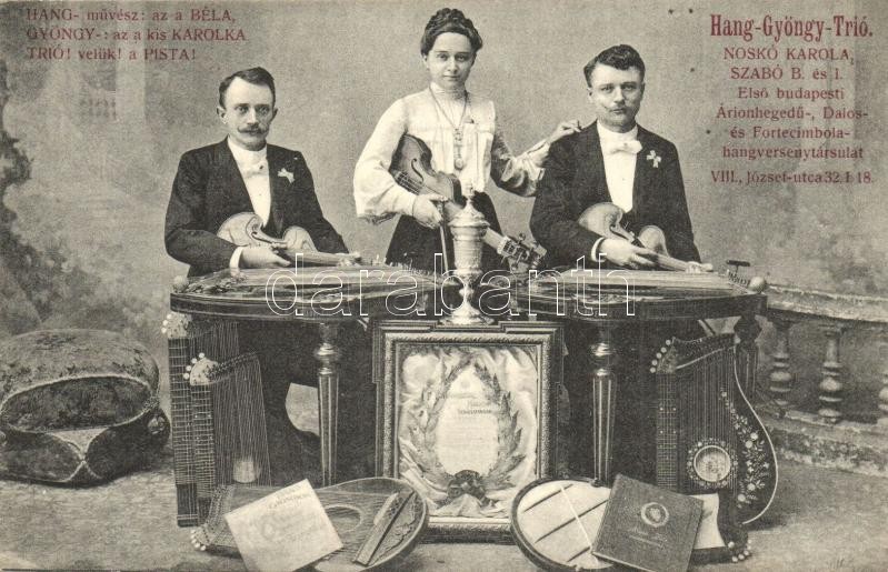Beschreibung: Budapest VIII. Hang-Gyöngy-Trió. Noskó Karola, Szabó B. és I. első budapesti árionhegedű-, dalos- és fortecimbola hangversenytársulat. József utca 32.