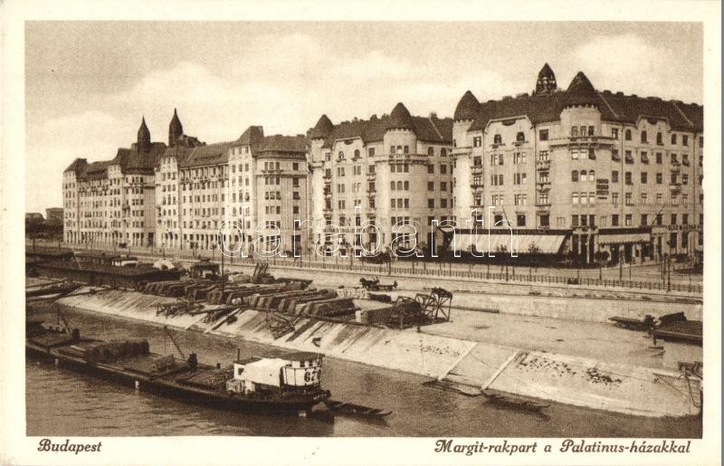 Beschreibung: Budapest XIII. Margit rakpart, Palatinus házak, Magyar Földrajzi Intézet rt., Rudolf Park Kávéház, 670-es uszály (EK)
