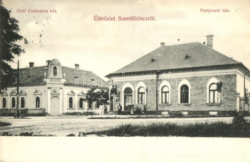 Beschreibung: Budapest XVIII. Pestszentlőrinc, Szentlőrinc, Pusztaszentlőrinc; Gróf Csekonics és Postpischl házak. Fischhof Henrik kiadása (EK)