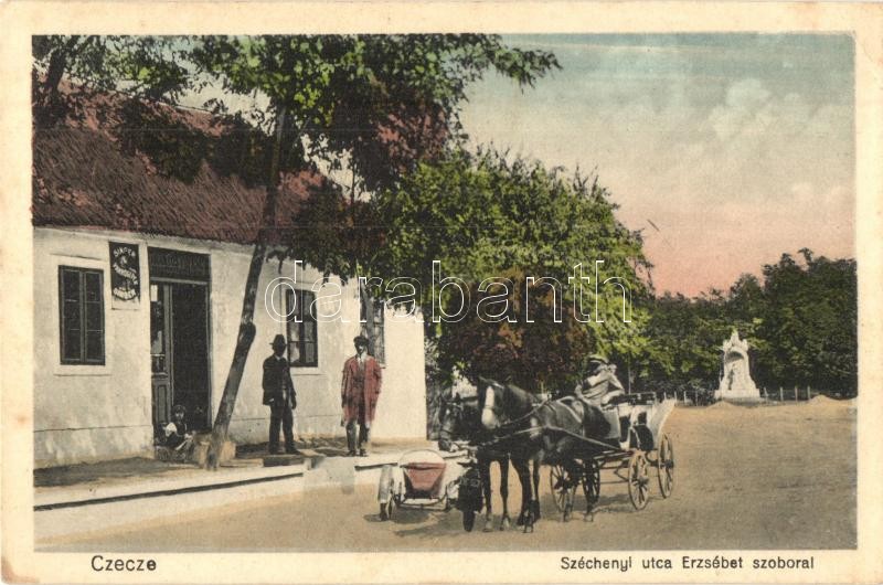 Beschreibung: Cece, Czecze; Széchenyi utca, Erzsébet szobor, lovaskocsi, motorkerékpár, Aranyos vegyeskereskedése és Singer varrógép üzlete (EK)