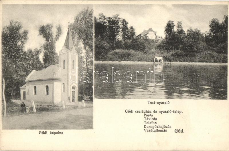 Göd, kápolna, Tost nyaraló. Sződrákosi és Gödi tégla- és cementlap gyá... https://www.darabanth.com/de/324-Fernauktion/324.0/Ansichtskarten/Ungarn~2000006/God-kapolna-Tost-nyaralo-Szodrakosi-es-Godi-tegla-es-cementlap-gyarak-kozponti-iroda~II1803179