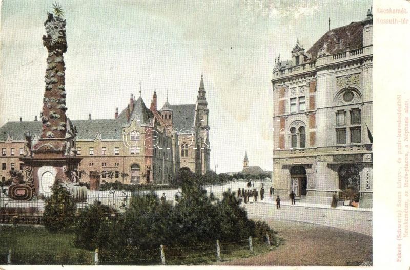 Beschreibung: Kecskemét, Kossuth tér, Városháza, Gyenes üzlete, Szentháromság szobor. Fekete (Schwartz) Soma kiadása (fl)