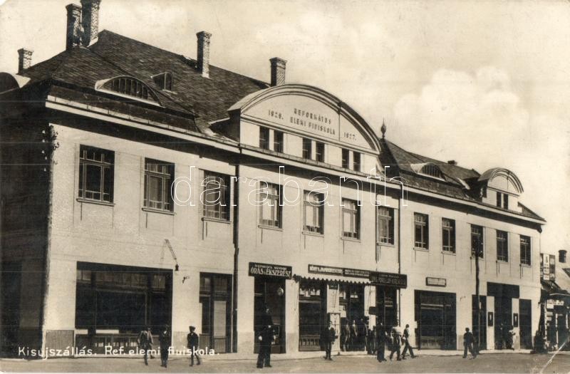 Kisújszállás, Református elemi fiúiskola, Weinstock Sándor órás és ékszerész, Strasser, Lapis Mihály, könyv és papírkereskedés és dohánybolt üzlete. Záhony Lajos kiadása (EM)