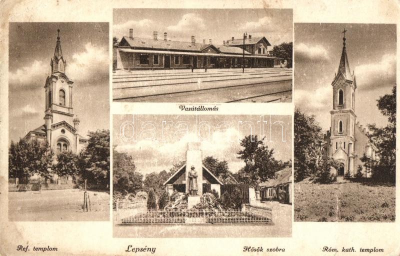 Lepsény, Vasútállomás, Hősök szobra, református és római katolikus tem... https://www.darabanth.com/de/324-Fernauktion/324.0/Ansichtskarten/Ungarn~2000006/Lepseny-Vasutallomas-Hosok-szobra-reformatus-es-romai-katolikus-templom-fa~II1798893