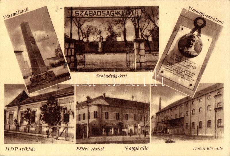 Beschreibung: Nagykálló, Váremlékmű, Szabadság kert, Simonyi emlékmű, MDP székház, Fő tér, Dohánybeváltó (EK)