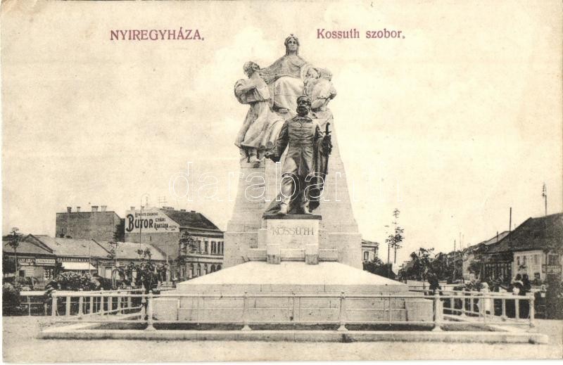 Beschreibung: Nyíregyháza, Kossuth Lajos szobor, Lefkovits Zsigmond bútor raktára, Präger és Domány, Frank Géza üzlete (EK)