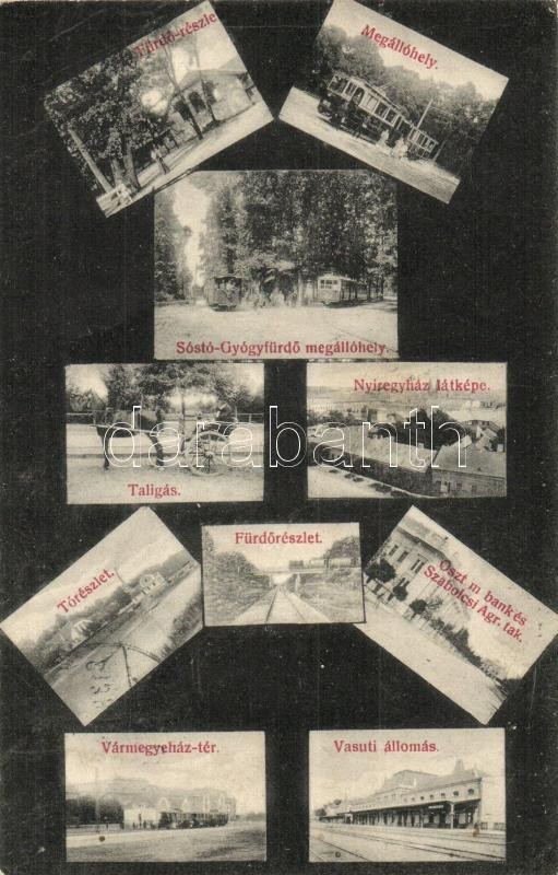 Beschreibung: Nyíregyháza, Sóstógyógyfürdő; vasútállomás, megállóhelyek, taligás, Osztrák-magyar bank és Szabolcsi Agrár takarékpénztár, Vármegyeház tér (EK)