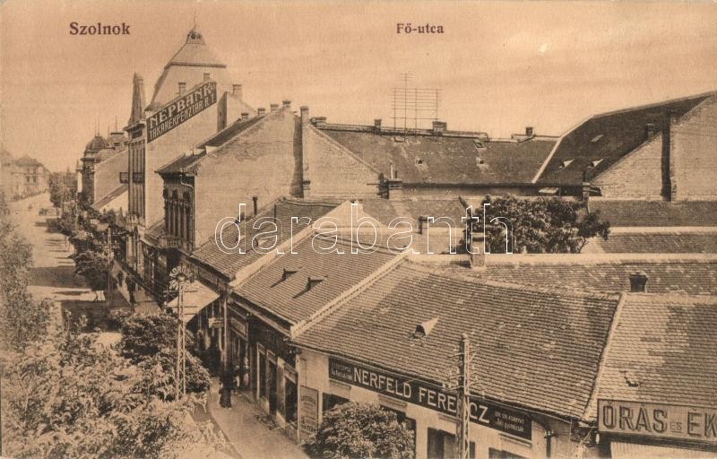 Szolnok, Fő utca, Népbank és takarékpénztár rt., órás és ékszerész, Schwarcz Károly és Nerfeld Ferencz bor és sör üzlete, Korona Kávéház. Gerő Ignácz kiadása