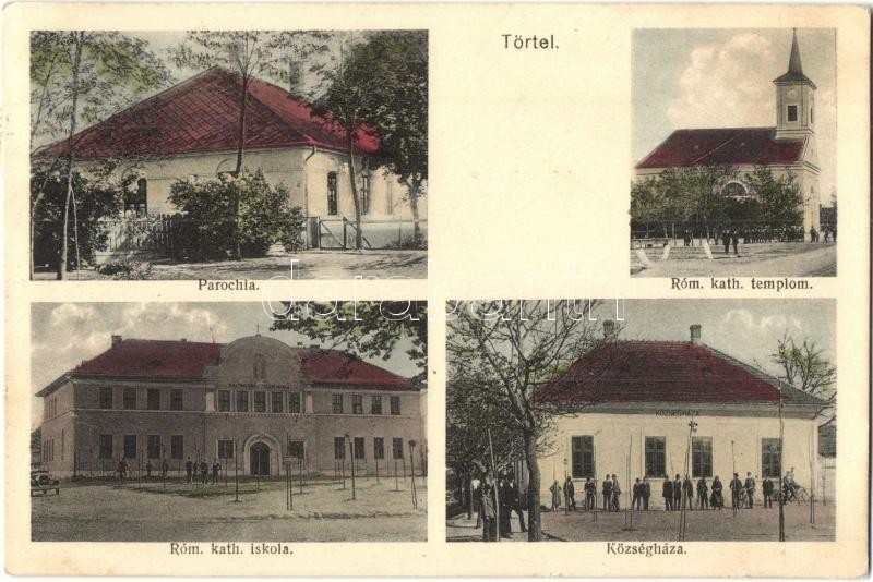 Beschreibung: Törtel, Parókia, Római katolikus templom és iskola, Községháza, kerékpár, automobil