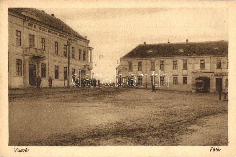 Vasvár, Fő tér, Hotel Korona szálloda és vendéglő, étterem, Hotel Zöldfa szálloda, Zsilinszky István szállodája, Löwing üzlete. Schrammel László kiadása