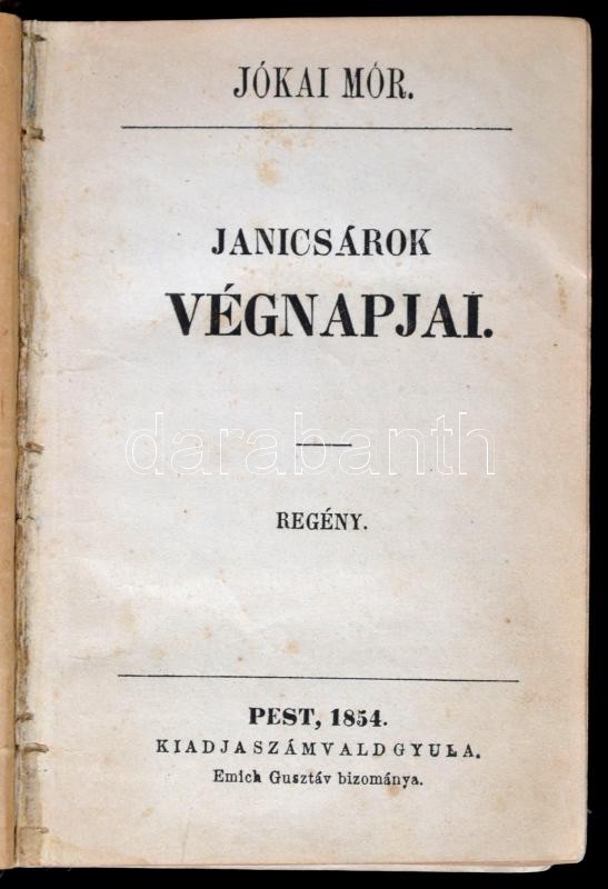 Jókai Mór: Janicsárok végnapjai. II. kötet. Pest, 1854, Számvald Gyula, 506+2 p. Első kiadás. Átkötött félvászon-kötés, kopott borítóval, sérült gerinccel, a 211-222. oldal a 202-203. oldal közé van bekötve, 229. oldaltól nyomdahibás számozással (212-vel folytatódik, 490-503. oldalak között a két lap sérült, hiányos, valamint oldalhiány.