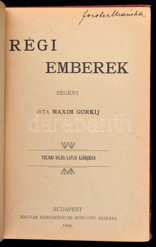 Maxim Gorkij: Régi emberek. Bp., 1904 Tolnai. Aranyozott egészvászon k... https://www.darabanth.com/de/324-Fernauktion/324.0/Bucher/Bucher-Andere-kuriositaten~1000018/Maxim-Gorkij-Regi-emberek-Bp-1904-Tolnai-Aranyozott-egeszvaszon-kotesben~II1773845